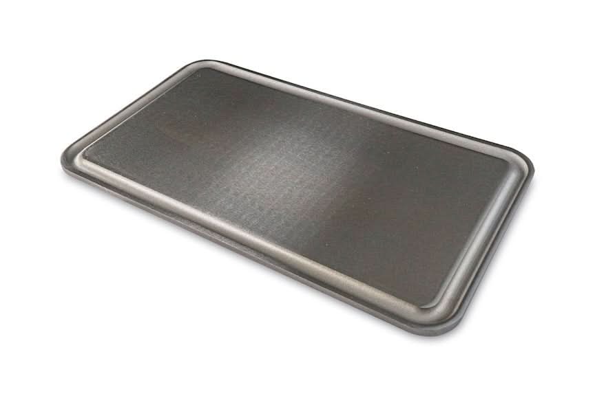 An 11.5" x 20" x 3/8" thick reversible carbon steel slab. One side is a smooth flat-top griddle for stovetop cooking. The other is a textured Baking Steel for pizza and bread. At 22 pounds, it spans two burners in a slim profile that leaves room on your stovetop.